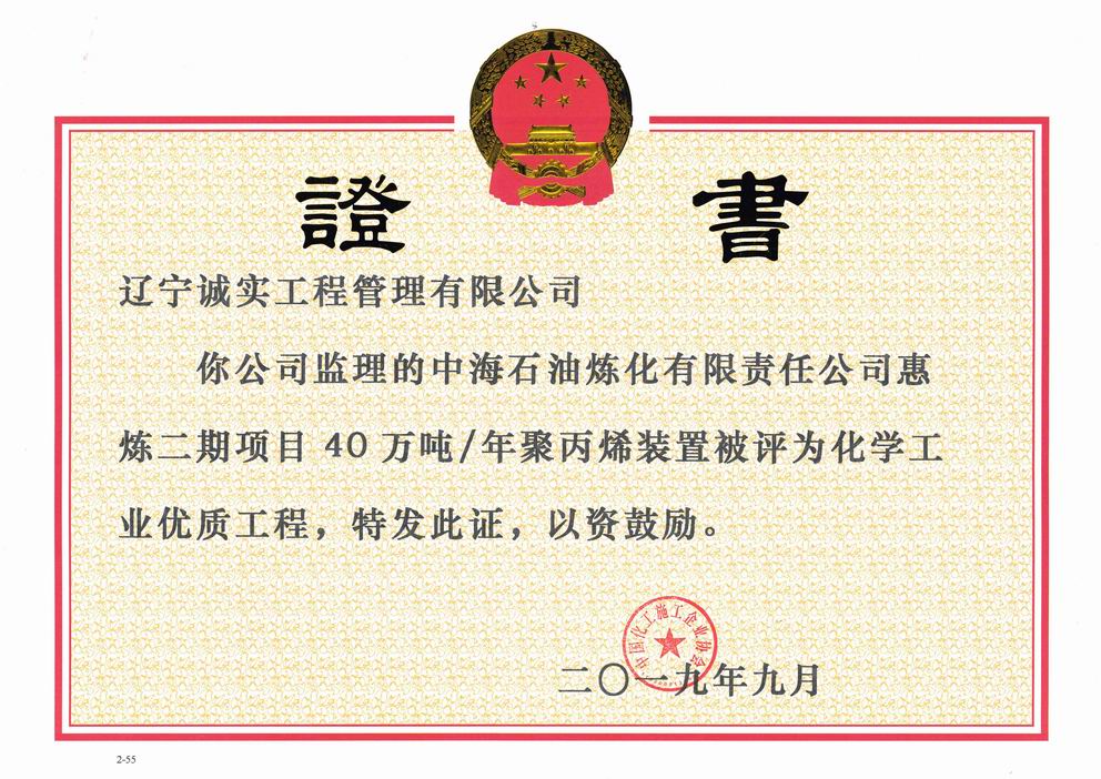 2019年化学工业优质奖(中海油惠炼二期项目40万吨/年聚丙烯装置)