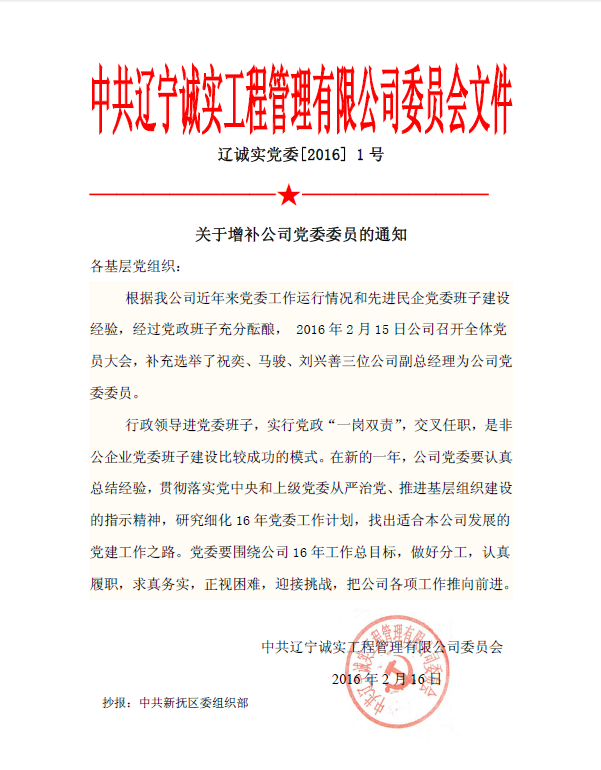 中共星空手机官方网站入口,星空(中国)委员会文件——关于增补公司党委委员的通知