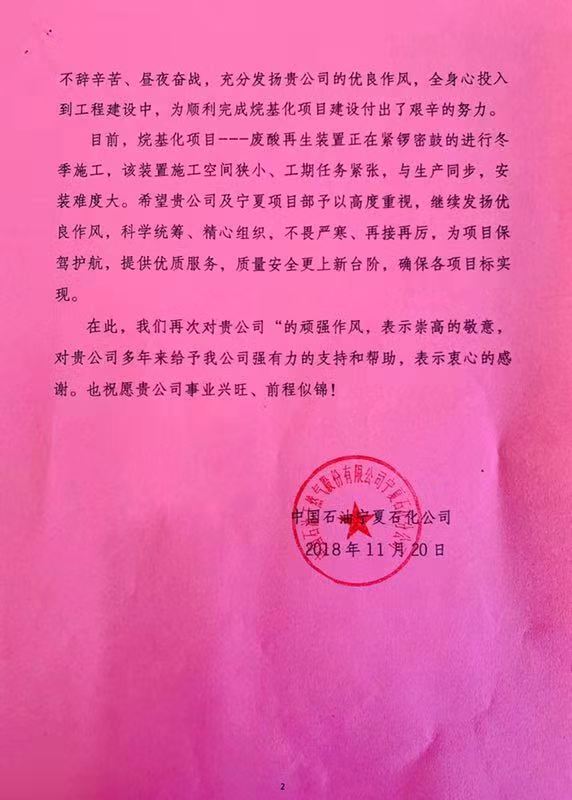 2018年11月20日,我公司收到了一封来自业主——中国石油天然气股份有限公司宁夏石化分公司的感谢信。