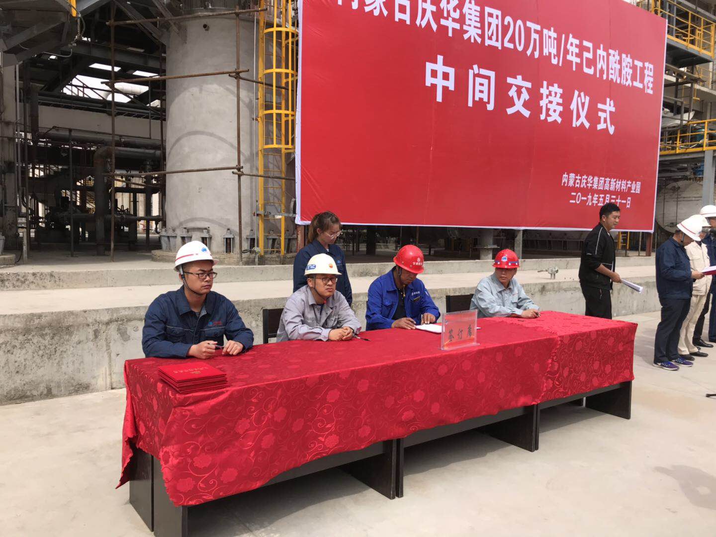 5月31日上午10:00内蒙古庆华集团20万吨/年己内酰胺工程进行了中间交接,辽宁诚实腾格里项目部总监孙典在交接仪式上进行了签字。交接的部分装置有:精制、肟化、硫铵车间。