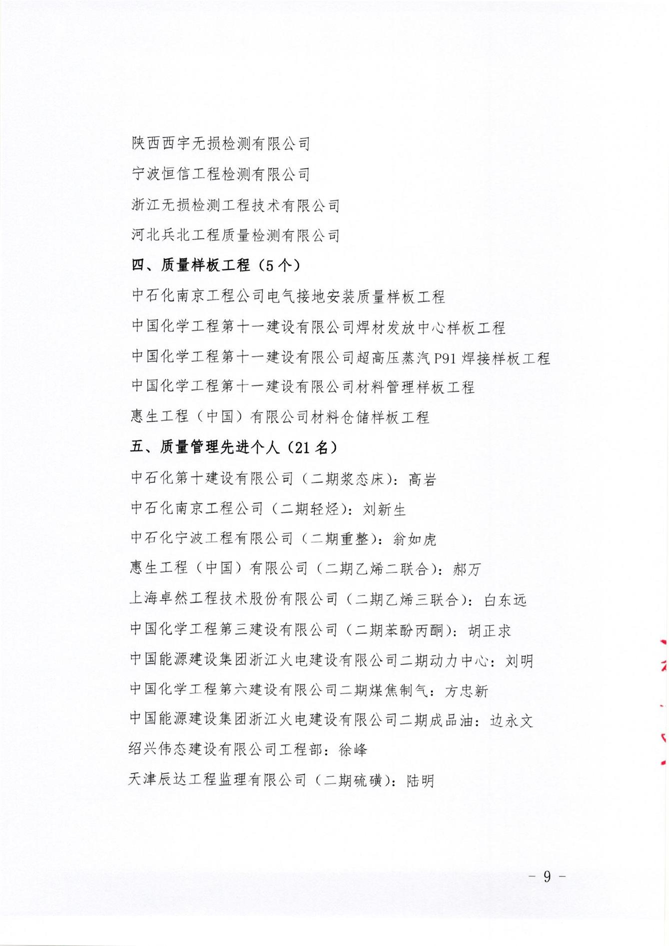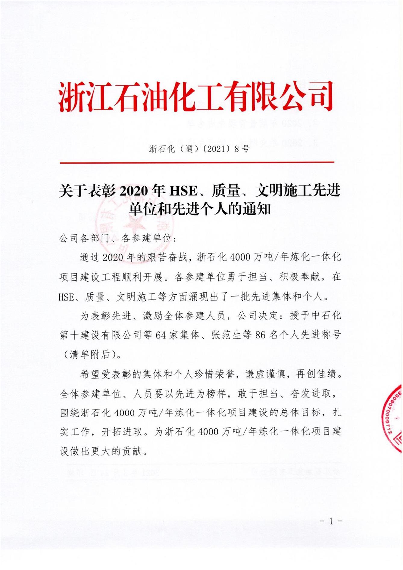 热烈祝贺沈志强同志荣获浙江石油化工有限公司4000万吨/年炼化一体化项目“质量管理先进个人”荣誉称号