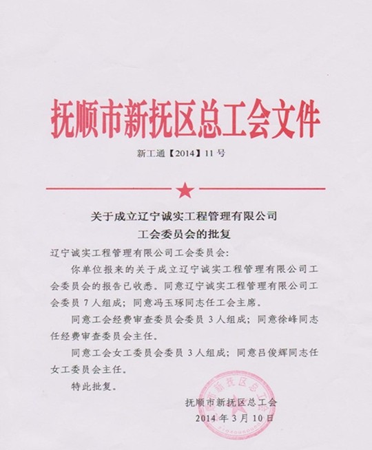经过近两个月的筹备,诚实工会现已履行完毕各个筹备程序,抚顺市新抚区总工会已正式批准成立星空手机官方网站入口,星空(中国)工会委员会。公司工会由7名委员组成,下设经费审查委员会和女工委员会。公司工会将根据机关及项目部的实际情况,相应成立工会分会和工会小组,发挥工会在企业中的积极作用,为企业的发展做出贡献。